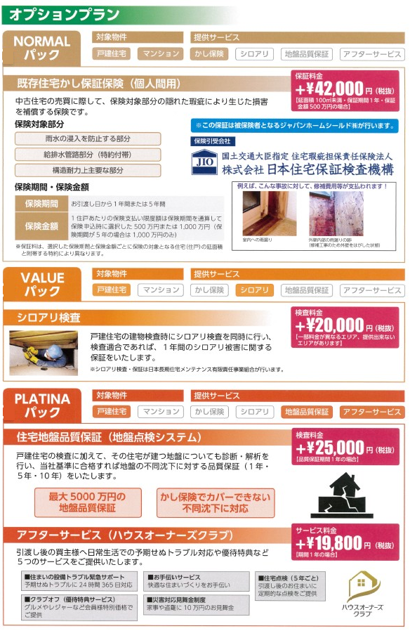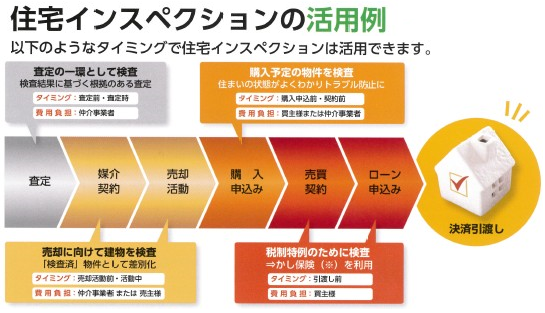上記は参考例として記載しております。なお、費用負担者が買主様または売主様となる場合でも、弊社を経由でお願いします。既存住宅瑕疵保証保険の検査は契約後でなくても結構です。売却活動前などに行った検査で適合していれば、契約後に既存住宅瑕疵保証保険のお申込みができます。(ただし検査後1年を経過した場合には再度検査が必要です)また検査と既存住宅瑕疵保証保険は申込者が別でも承れます。